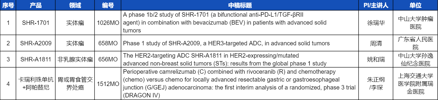 本次ESMO大会,将由中山大学肿瘤医院徐瑞华教授、广东省人民医院周清教授、中山大学孙逸仙纪念医院姚和瑞教授、上海交通大学医学院附属瑞金医院李琛教授分别就4项AG电子医药创新产品相关研究做口头报告,包括SHR-1701、SHR-A2009、SHR-A1811这3款未上市创新产品的实体瘤治疗临床研究,以及1项“双艾”组合(卡瑞利珠单抗联合阿帕替尼)治疗局部晚期可切除胃/胃食管交界处癌的Ⅲ期临床试验期中分析。