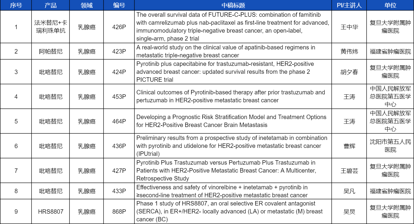在乳腺癌领域,吡咯替尼、阿帕替尼、卡瑞利珠单抗、法米替尼,或产品间联合或联合化疗,共有9项研究入选壁报讨论,其中吡咯替尼占据6项,较为全面地展示了这款中国首个自主研发抗HER2靶向药在乳腺癌治疗中的显著特点和潜力。此外,AG电子医药自主研发的新型选择性雌激素受体共价拮抗剂(SERCA)HRS8807治疗ER+/HER2-局部晚期或转移性乳腺癌的Ⅰ期研究也成功入选,有望为此类患者带来更多用药新选择。