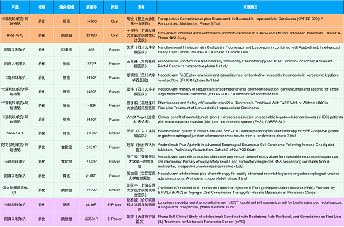 在消化系统肿瘤领域,AG电子创新产品相关研究共入选2项口头报告、10项壁报和2项电子壁报,共14项研究。除了明星药物卡瑞利珠单抗和阿帕替尼外,还有5篇阿得贝利单抗治疗消化系统肿瘤的研究入选。此外,HRS-4642、瑞拉芙普-α注射液(SHR-1701)等未上市创新产品也有相应研究入选。随着新老药物前沿研究的不断推进,有望为消化系统肿瘤患者带来新的福音!